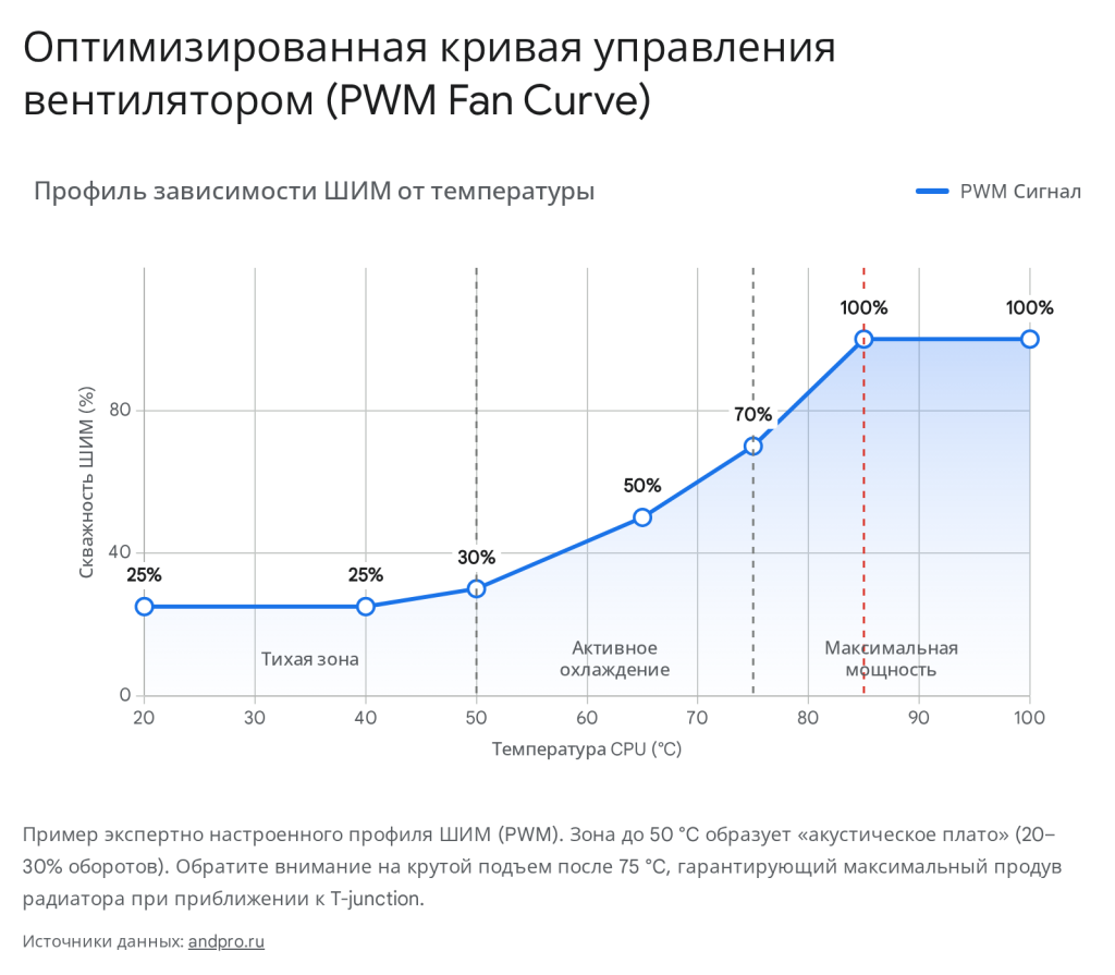 Грамотная кривая управления строится с использованием зонной архитектуры. До температуры 50–55 °C устанавливается «акустическое плато» — вентиляторы работают на минимальных оборотах (20-30% ШИМ), обеспечивая абсолютную тишину. Теплоемкости самого металла радиатора вполне достаточно для абсорбции кратковременных всплесков тепла от фоновых процессов операционной системы.