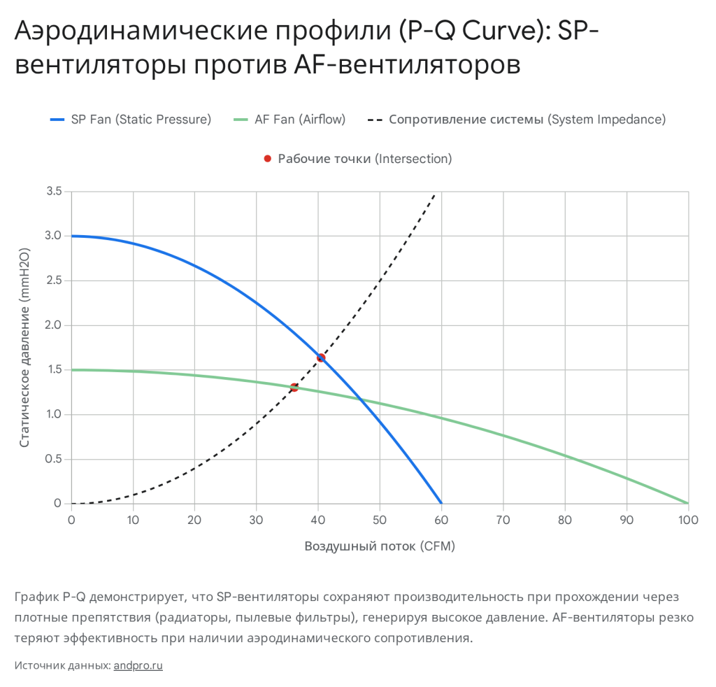 Вентиляторы, оптимизированные для создания максимального воздушного потока (Airflow), оснащаются множеством узких лопастей с острым углом атаки. Их задача — перемещение максимального объема воздуха (CFM) в условиях минимального сопротивления. Такие модели категорически нельзя устанавливать на плотные радиаторы или перед толстыми пылевыми фильтрами, так как они не способны создать напор для продавливания потока. Для преодоления преград используются вентиляторы, оптимизированные для создания статического давления (Static Pressure). Они отличаются широкими, массивными лопастями с минимальным зазором между краем крыльчатки и рамкой статора, что предотвращает обратную утечку воздуха по краям.