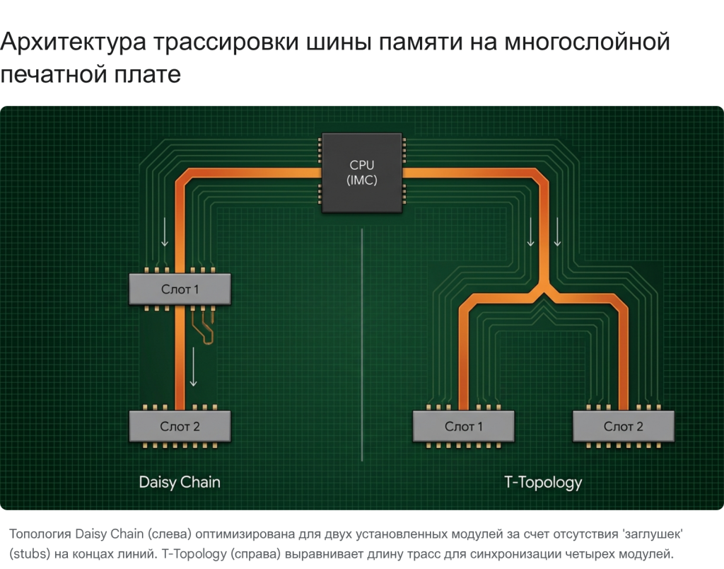 T-Topology (Т-образная топология): В данном варианте маршрутизации медная трасса от контроллера памяти доходит до определенной геометрической точки между слотами одного канала, а затем симметрично разветвляется (образуя букву T) на абсолютно равные по физической длине отрезки к двум слотам. Эта конфигурация инженерно оптимальна исключительно при полном заполнении банков памяти (конфигурации с четырьмя модулями). Абсолютное равенство длин трасс гарантирует, что сигнал дойдет до обоих модулей строго одновременно, что устраняет проблемы фазовых задержек (Skew) при синхронизации работы четырех планок. Однако максимальная достижимая частота (Bandwidth ceiling) в такой топологии всегда ниже, чем в Daisy Chain, из-за огромной физической сложности создания идеального согласования волнового импеданса в узле Y-образного ветвления на текстолите платы.
