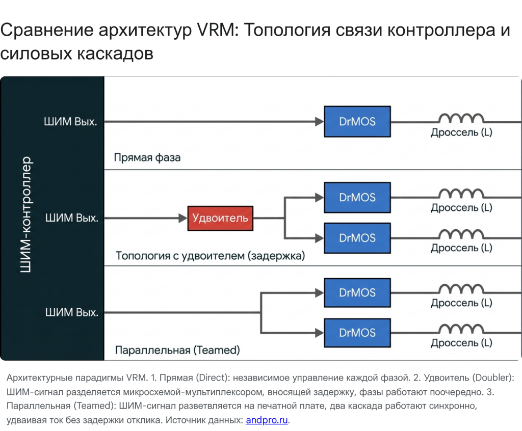 Разводка сигнальных линий от ШИМ-контроллера к массиву силовых каскадов (топология VRM) является главным полем инженерных споров. В индустрии конструирования материнских плат устоялись три фундаментальных архитектурных подхода: прямая топология (Direct / True Phase), топология с удвоителями (Doubler Topology) и параллельная сдвоенная разводка (Teamed / Twin Power Stages).
