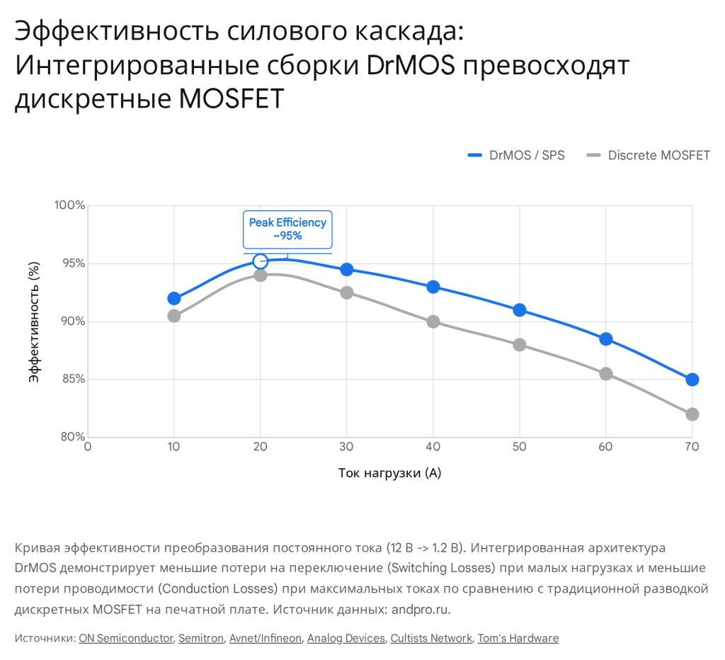 Пиковый КПД: Передовые сборки DrMOS (такие как серия FDMF от ON Semiconductor с технологией PowerTrench) способны преодолевать барьер эффективности в 93-95% при коммутации токов от 50 А до 105 А на каскад.