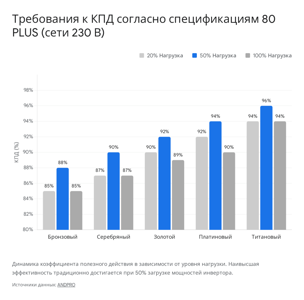 Эффективность преобразования переменного тока в постоянный (КПД) является критической метрикой, определяющей термическое поведение устройства. В индустрии эта метрика стандартизирована и измеряется согласно протоколам независимой сертификации 80 PLUS. Уровни сертификации отражают долю энергии, которая передается полупроводниковым компонентам системы; вся оставшаяся неусвоенная энергия трансформируется в паразитное тепло, рассеиваемое на радиаторах силовых элементов внутри корпуса.