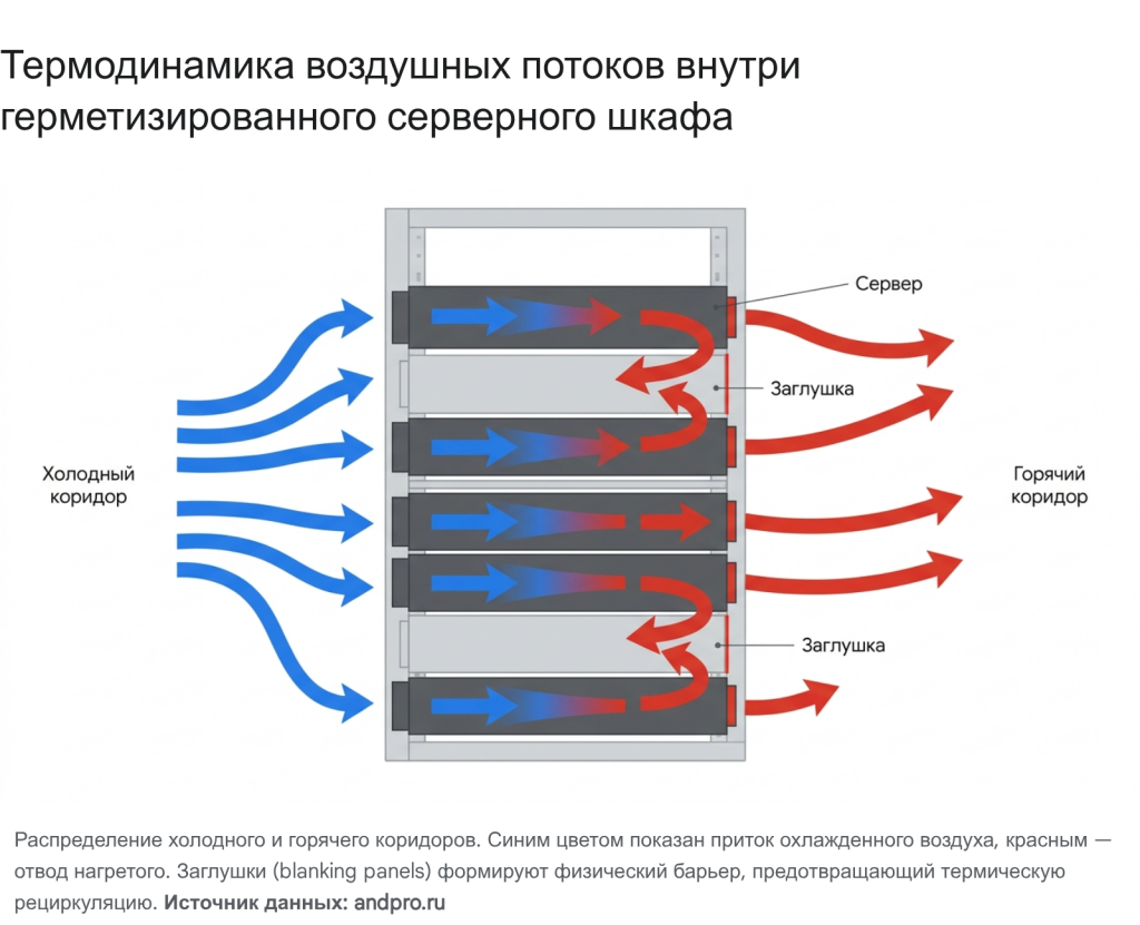 Технологические зазоры (Air gaps): Некоторые модели модульных маршрутизаторов или высокотемпературных блейд-шасси требуют по инструкции производителя оставлять 1U свободного пространства (закрытого заглушкой) сверху и снизу для предотвращения температурного влияния на соседнее оборудование и выравнивания статического давления.
