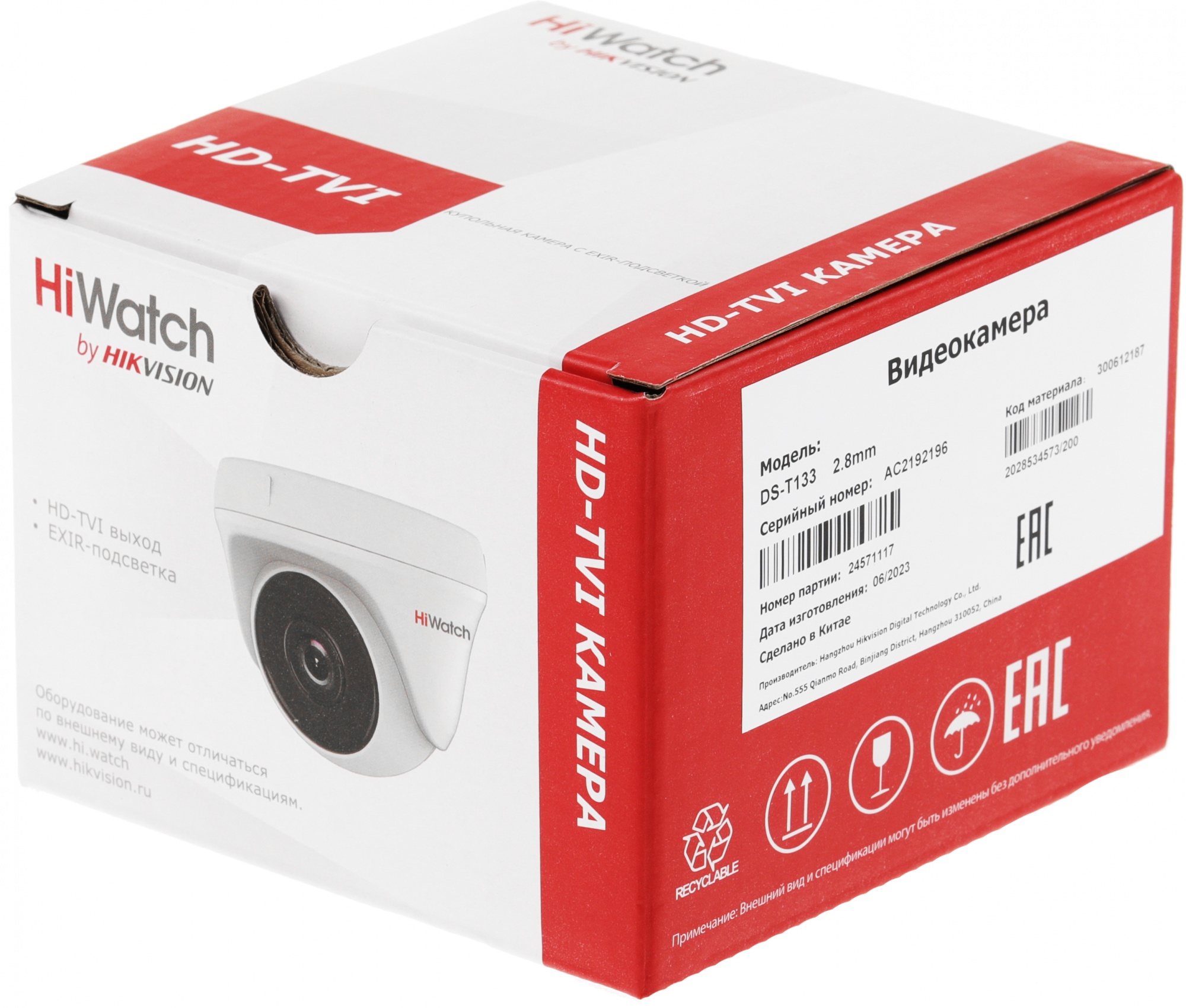 Камера видеонаблюдения HIKVISION - HiWatch DS-T133, HD-TVI камера, 1280 x 720, 2.8мм, CMOS 1/4", angle of view 92°, 25fps, angle V 0° - 75°, angle H 0 - 360°, IR range 20m, DS-T133 (2.8 MM)