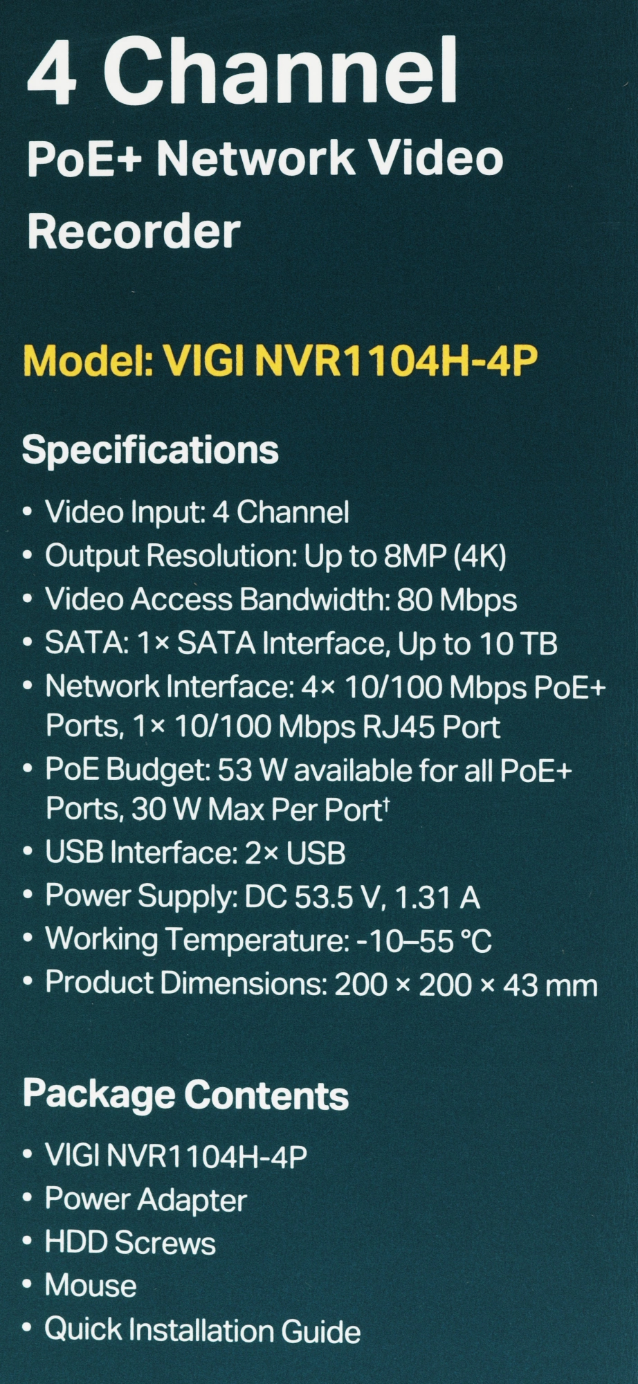 Видеорегистратор NVR TP-Link VIGI NVR1104H-4P 4-IP, 1-bay, VIGI NVR1104H-4P