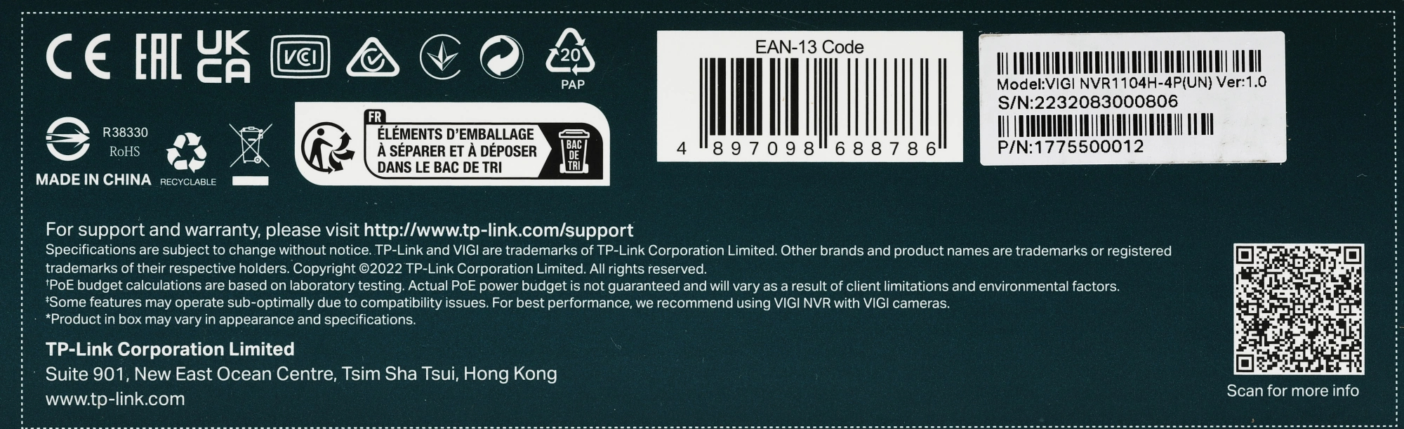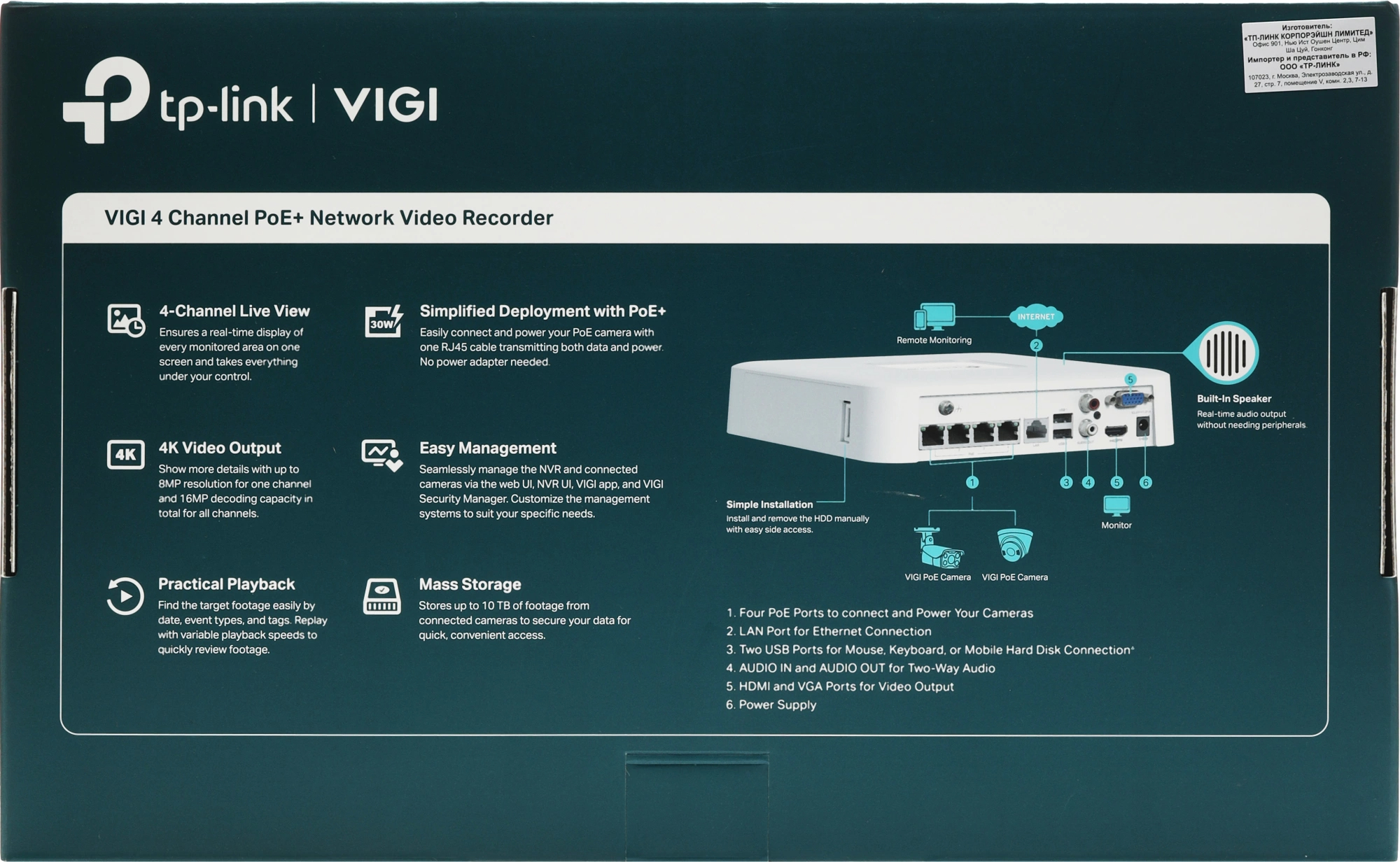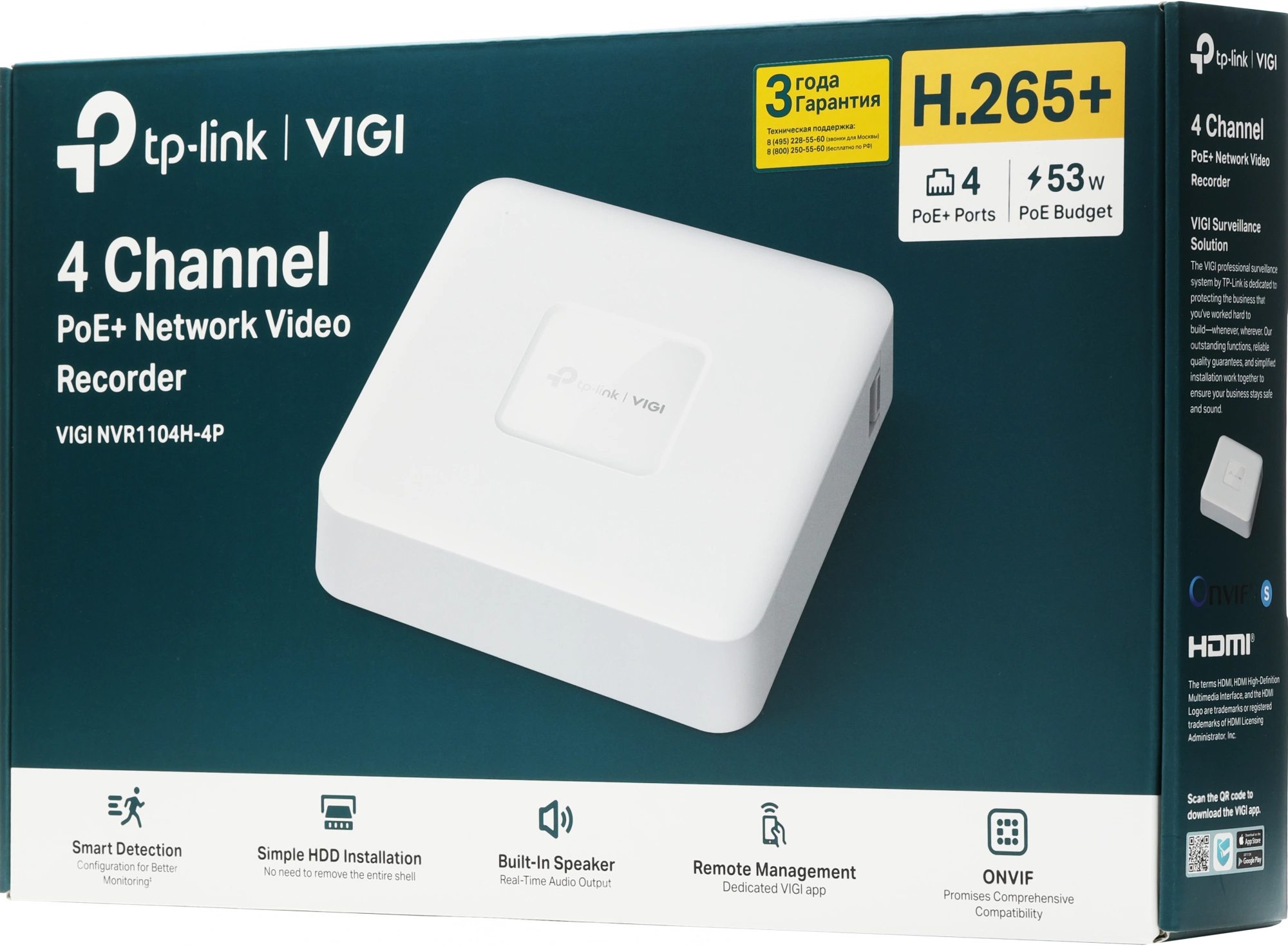 Видеорегистратор TP-Link VIGI NVR1104H-4P поддерживает 4 IP-камеры с PoE до 30 Вт каждая, упрощая монтаж без лишних адаптеров. Запись в 1080p и хранение на HDD до 6 ТБ обеспечивают чёткий архив.