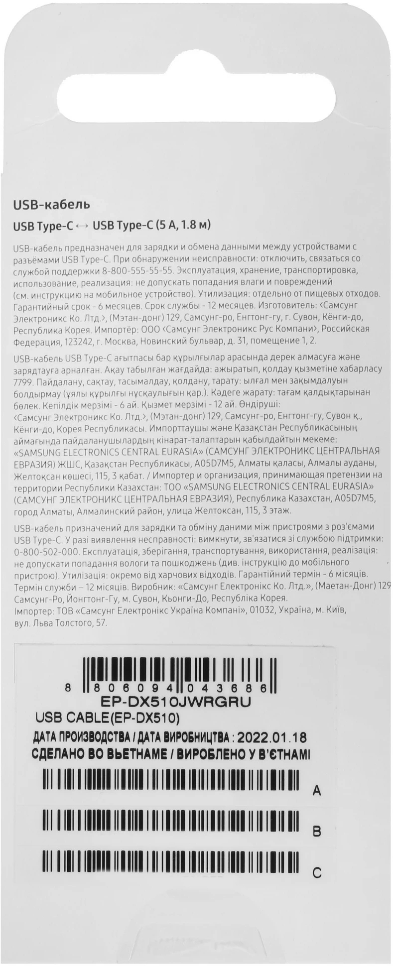 USB кабель Samsung, USB Type C (M) -> USB Type C (M) 5A, 1.8 м, EP-DX510JWRGRU