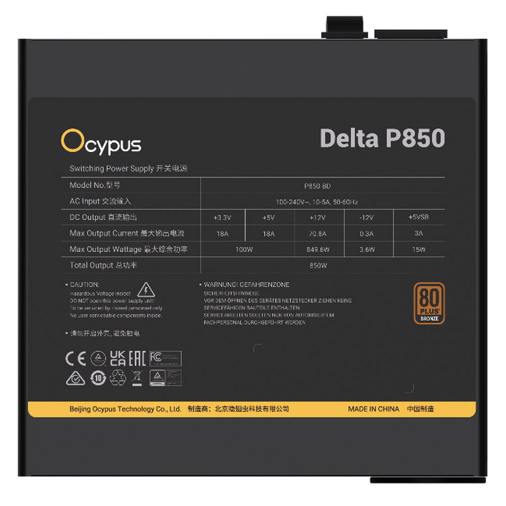 Блок питания для компьютера Ocypus - Delta, ATX, 80 PLUS Bronze, 850 Вт, Delta-P850-B1FDBK024X-EU