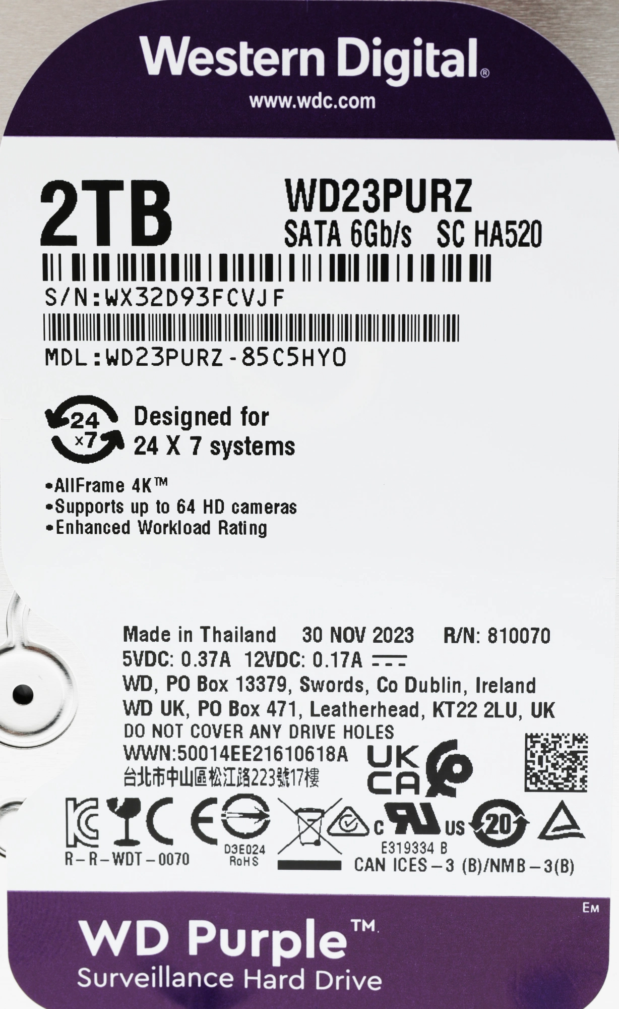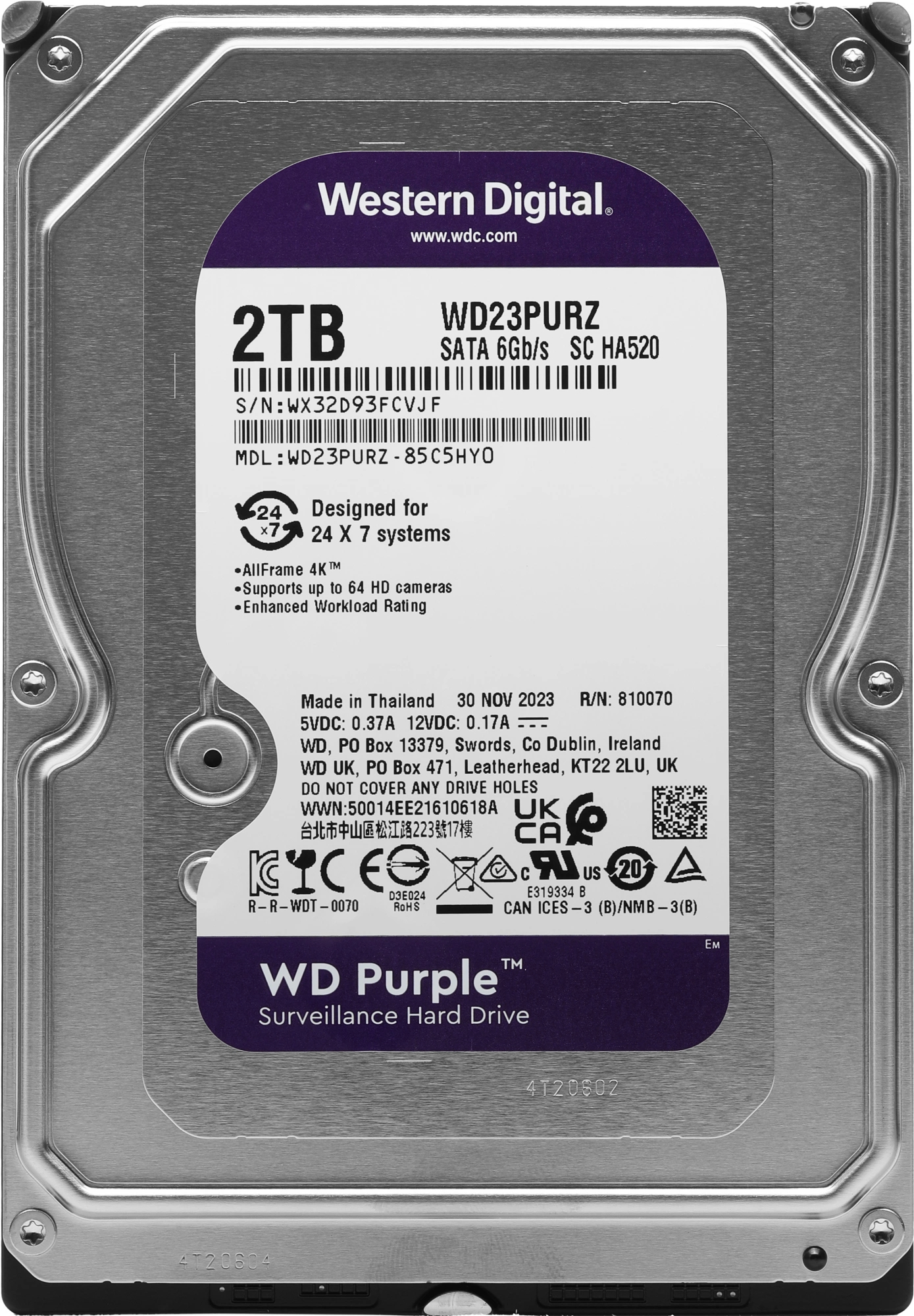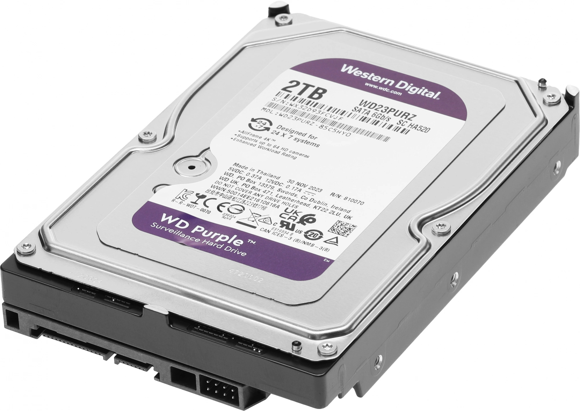 Диск HDD Western Digital - Purple, для систем видеонаблюдения, SATA, 6 Гб/с, 3.5", 2 ТБ, 5400 rpm, 64MB, WD23PURZ
