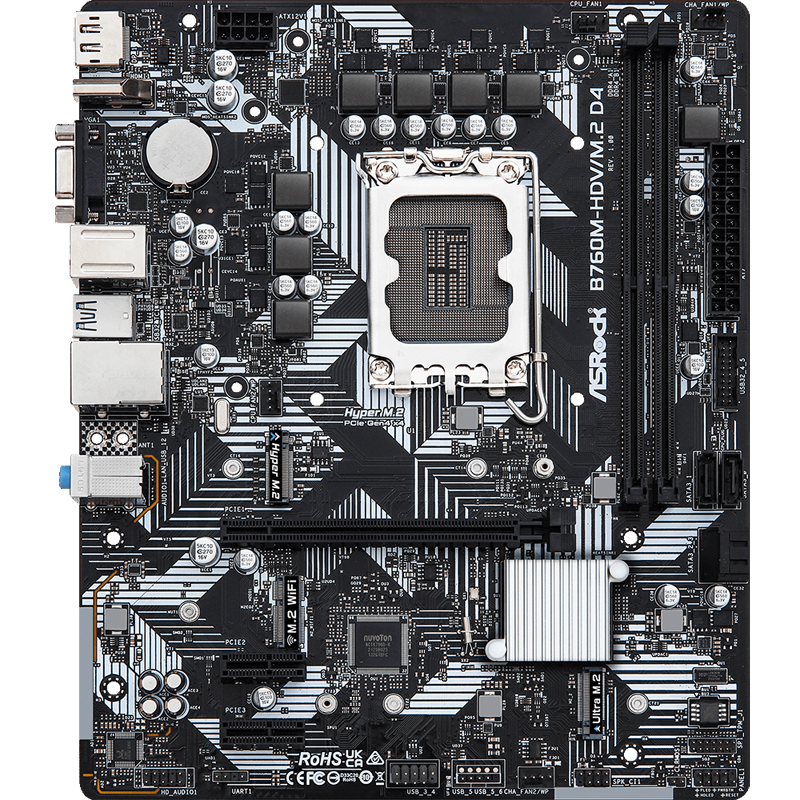 Материнская плата ASRock - B760M-HDV/M.2 D4, mATX, Intel B760, 1xLGA 1700, 2xDDR4 до 64ГБ, 1x1GbE, audio, M.2, VGA, HDMI, DP, 1xPS/2, 4xSATA, 2xUSB2.0, 3xUSB3.2, 1xUSB3.2 Type C, B760M-HDV/M.2 D4