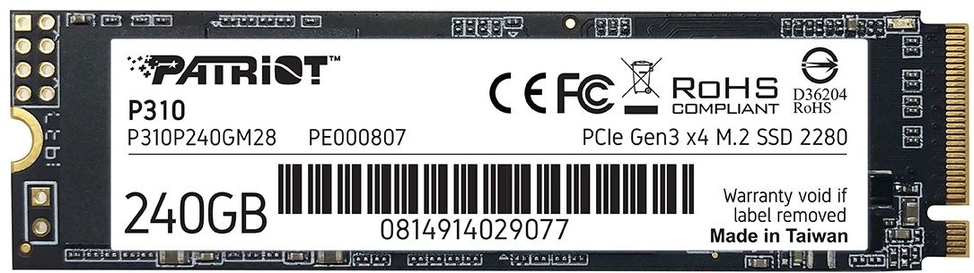 Диск SSD PATRIOT - P310, для ноутбука, M.2 2280, 240 ГБ, PCIe 3.0 NVMe x4, speed write-1000МБ/с read-1700МБ/с, TLC, P310P240GM28