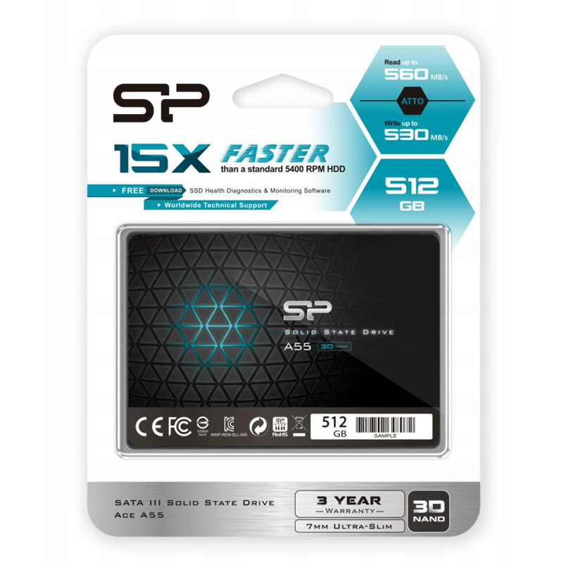 Диск SSD SILICON POWER - Ace A55, для ноутбука, 2.5", 512 ГБ, SATA, 6 Гб/с, speed write-530МБ/с read-560МБ/с, SP512GBSS3A55S25