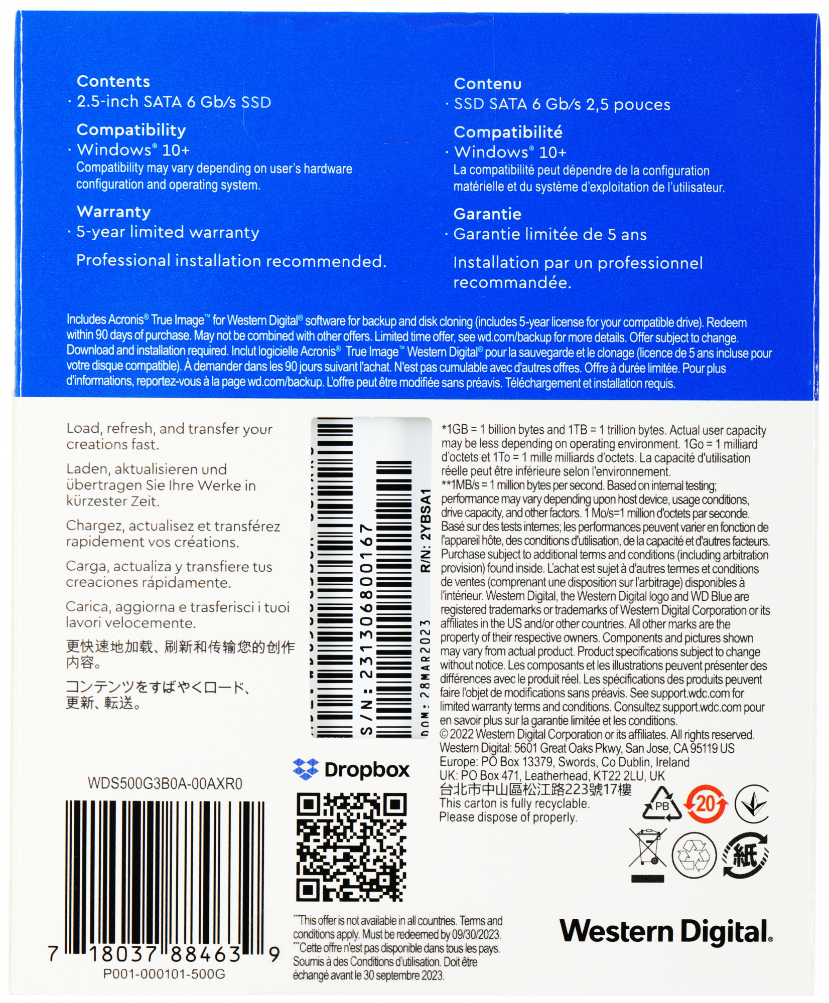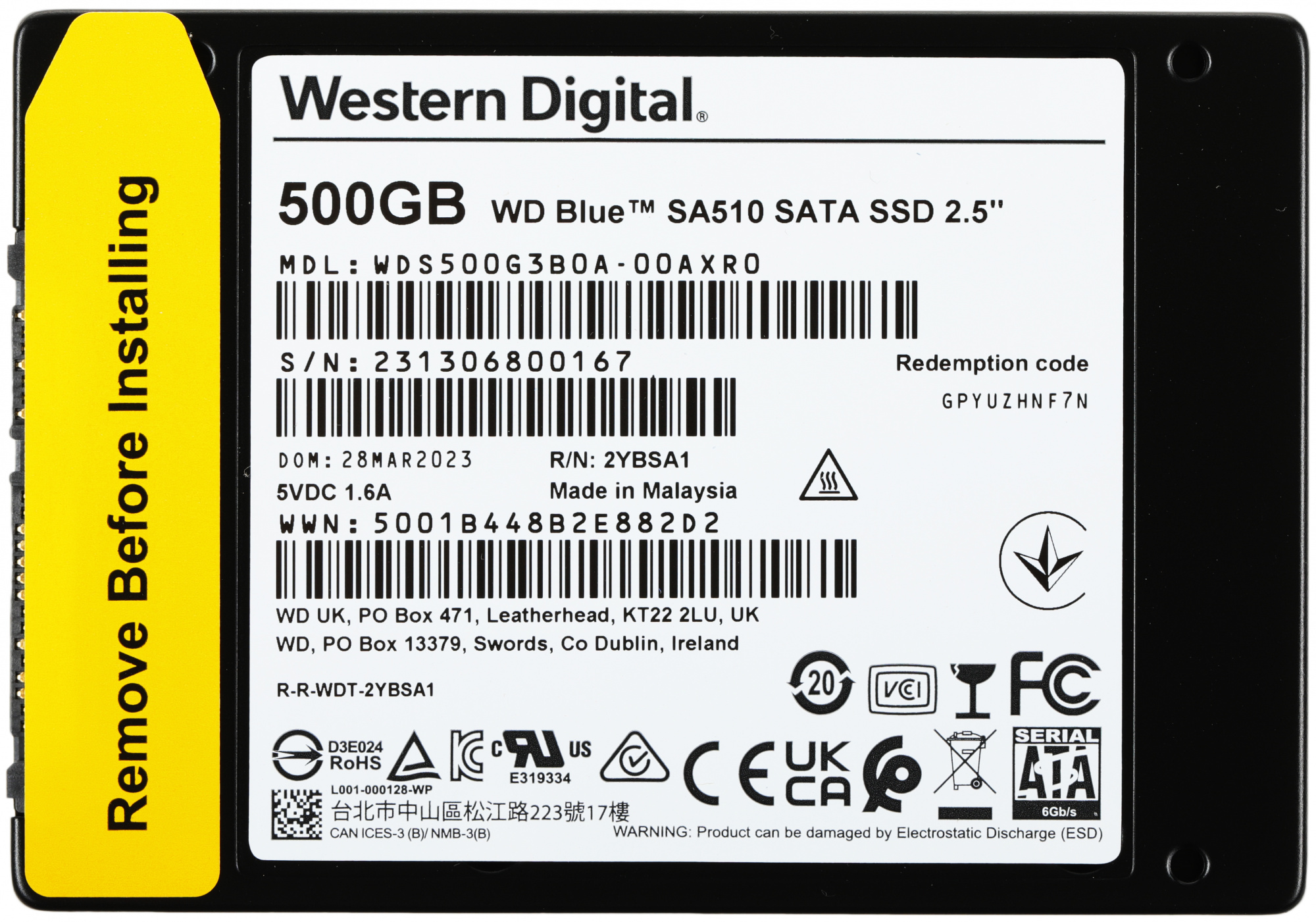 Диск SSD Western Digital - Blue SA510, для ноутбука, 2.5", 500 ГБ, SATA, 6 Гб/с, speed write-510МБ/с read-560МБ/с, TLC, WDS500G3B0A
