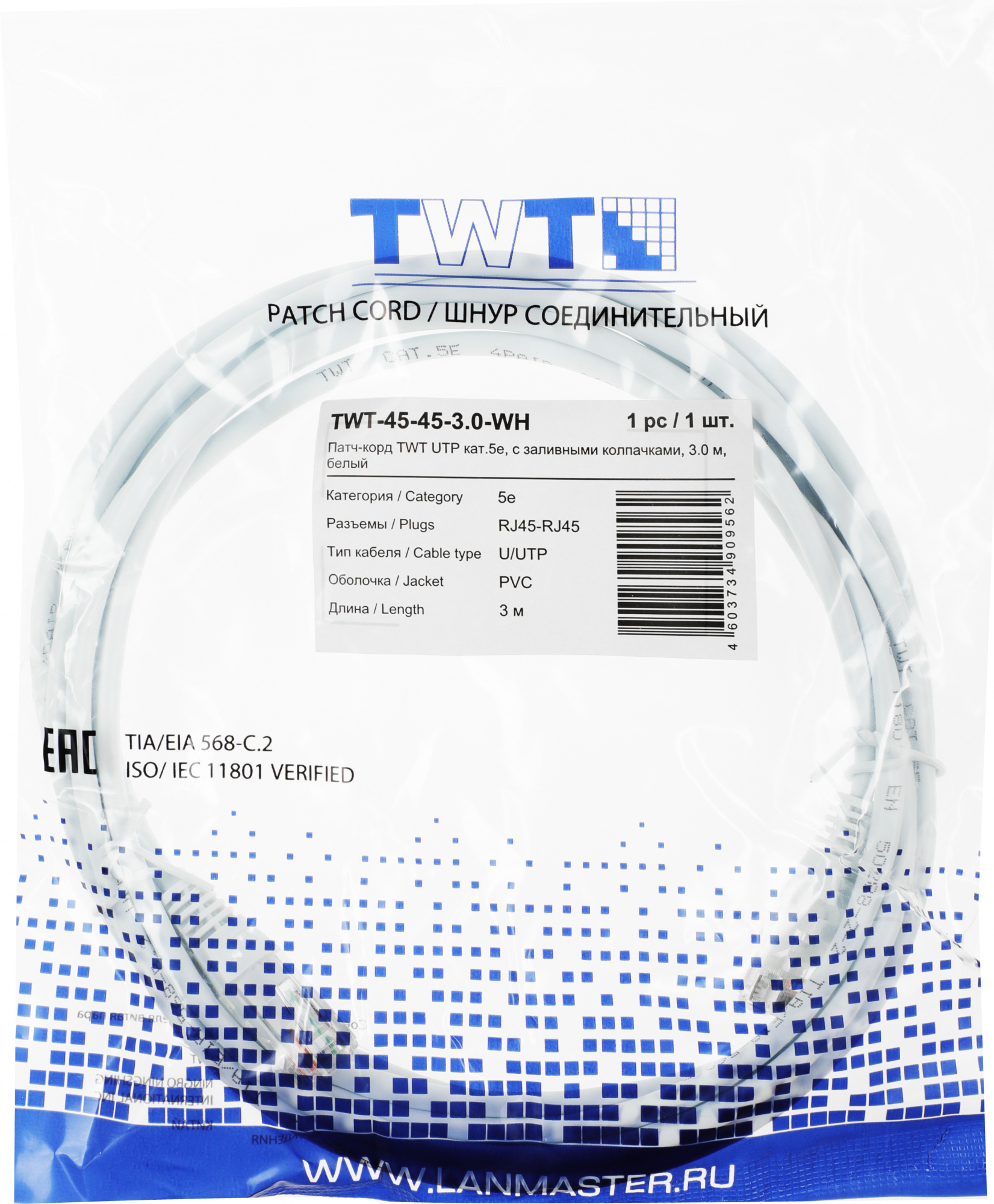 Патч-корд LANMASTER - TWT, UTP, кат. 5e, 2 x RJ-45, RJ-45 - RJ-45, ПВХ, белый, 3 м, с заливными колпачками, TWT-45-45-3.0-WH
