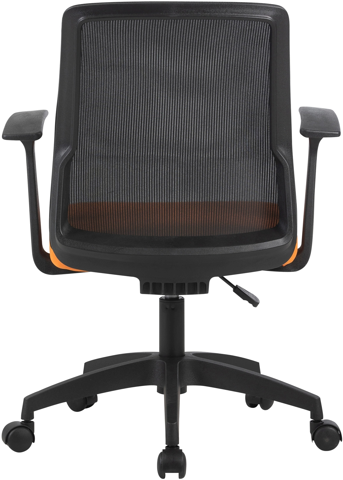 Черно-оранжевое кресло: выглядит динамично, сетка и ткань хорошо подобраны, поясничная поддержка чувствуется, колеса не скрипят.