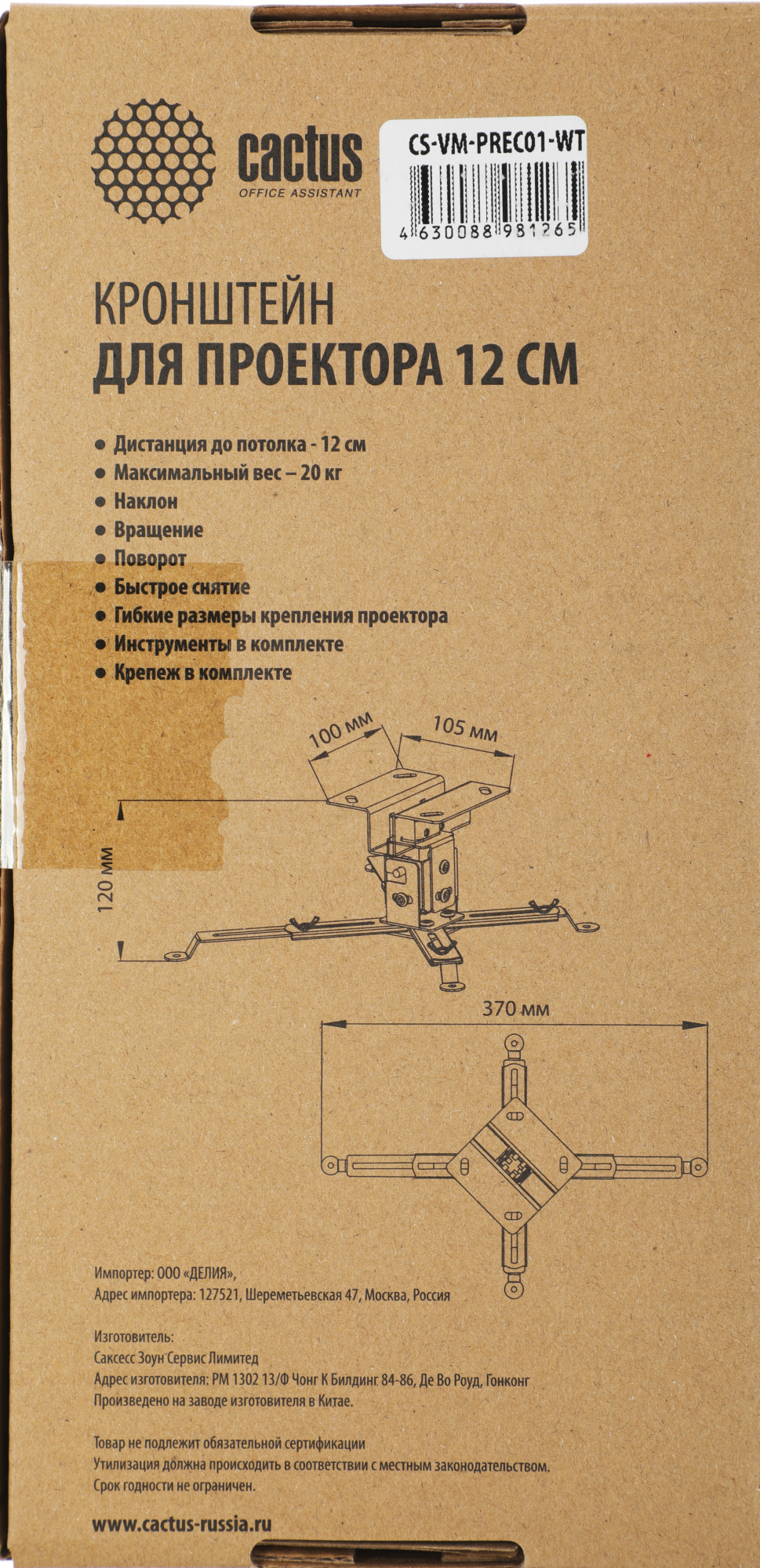 Кронштейн для проектора CACTUS VM-PREC01 потолочный, макс.23кг, CS-VM-PREC01-WT