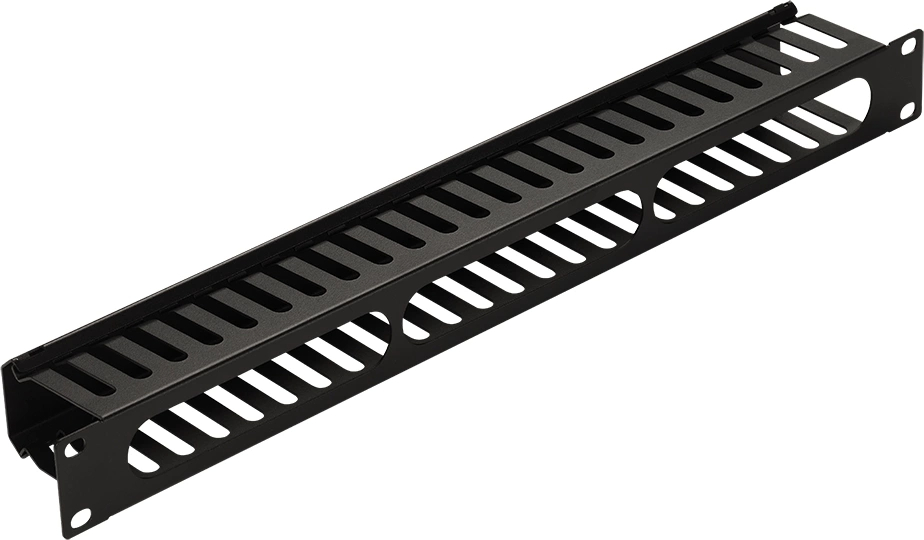 Вертикальный 2U, возможно для лотка 24 порта. Удобен при большом количестве кабелей, надёжные фиксаторы.