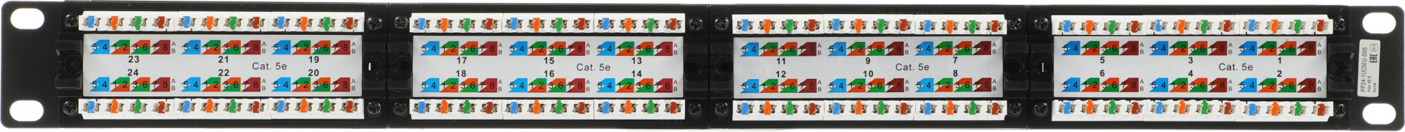 Ставил эту панель для 24 неэкранированных линий: монтаж на 19-дюймовую стойку прошёл гладко, каждая позиция подписывается. Категория 5e обеспечивает пропускную способность до нужной скорости, ничего не хрипит. Наконечники RJ-45 садятся чётко, не болтаются.