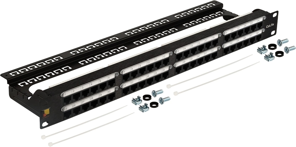 Панель на 48 портов выполнена из прочного металла. Разъёмы надёжные, маркировка удобная. Подходит для крупных сетевых проектов.