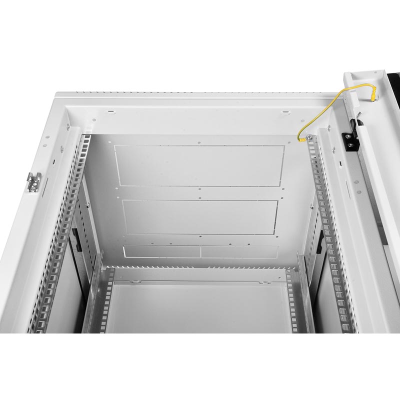 Много места для размещения сетевой техники, кабели аккуратно выводятся через спецотверстия. Конструкция крепкая, опоры регулируются по высоте. Стекло в дверце хорошей прочности, боковые стенки легко снимаются. Для небольших проектов такая глубина более чем достаточна.