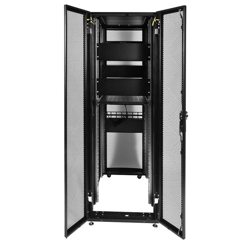 Разновидность на 42 юнита, 600_930, но с дополнительными усиливающими элементами. Отлично подходит для тяжёлых серверов, дверцы перфорированы, чёрная окраска, панели боковые снимаются. Собрали вдвоём, всё ровно, вентиляция адекватна.