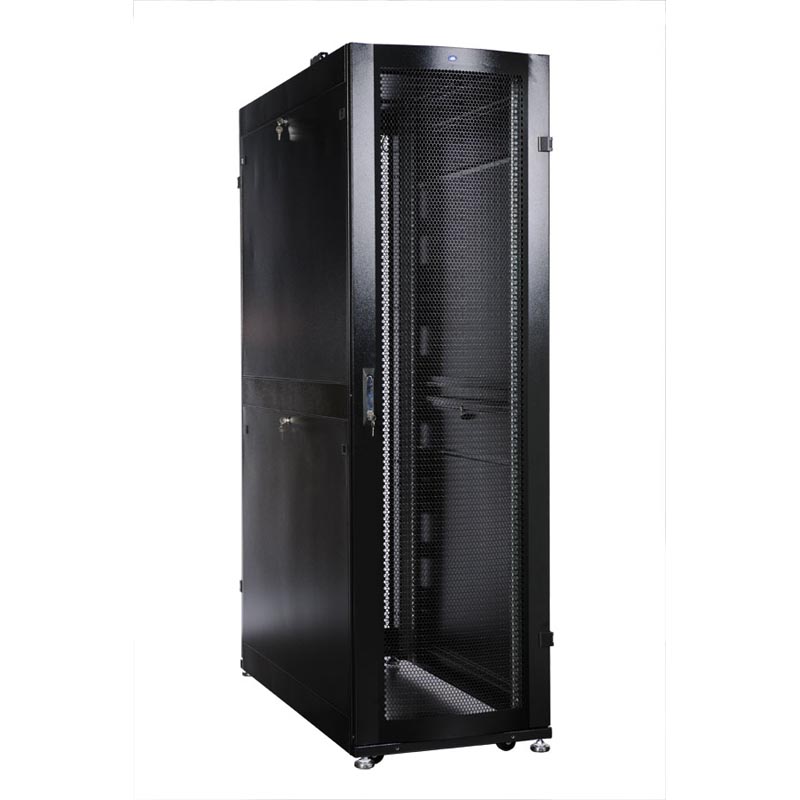 Для масштабных дата-центров этот шкаф подходит прекрасно. Открытые дверцы упрощают установку, потом закрываю – замки надёжные. Глубина 930 мм покрывает большинство длинных серверов, вентиляция через перфорацию плюс можно поставить кулеры. Смотрится красиво, чёрный окрас приятен.