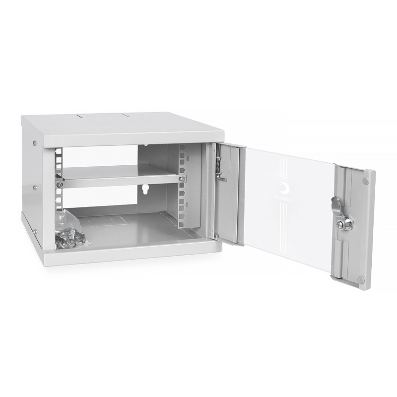 Компактный настенный кронштейн-ящик на 4 юнита, формат 10\, серый цвет. Идеально для небольшого роутера или патч-панели, сборка несложная, металл достаточно крепкий, дверь металлическая, замок нет, всё открыто.