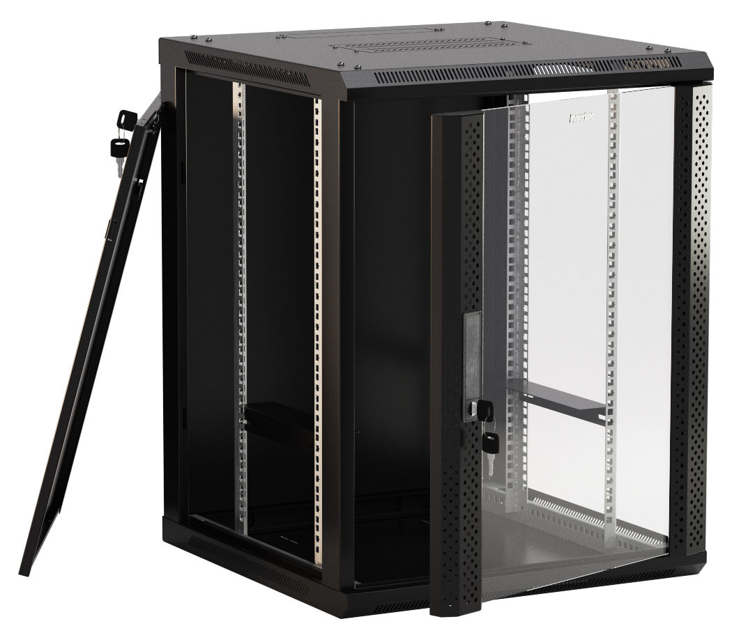 Если нужно разместить немалую инфраструктуру на стене, это решение. Высота 18U упорядочивает свитчи, маршрутизаторы, боковины несъёмные или с быстрым доступом в зависимости от модели. Понравилась добротность, замок рабочий, всё аккуратно.