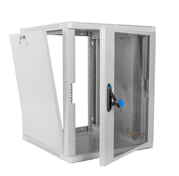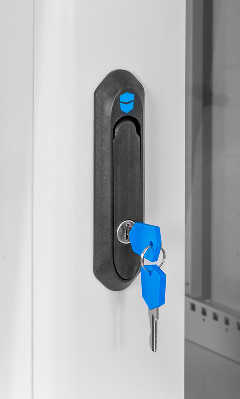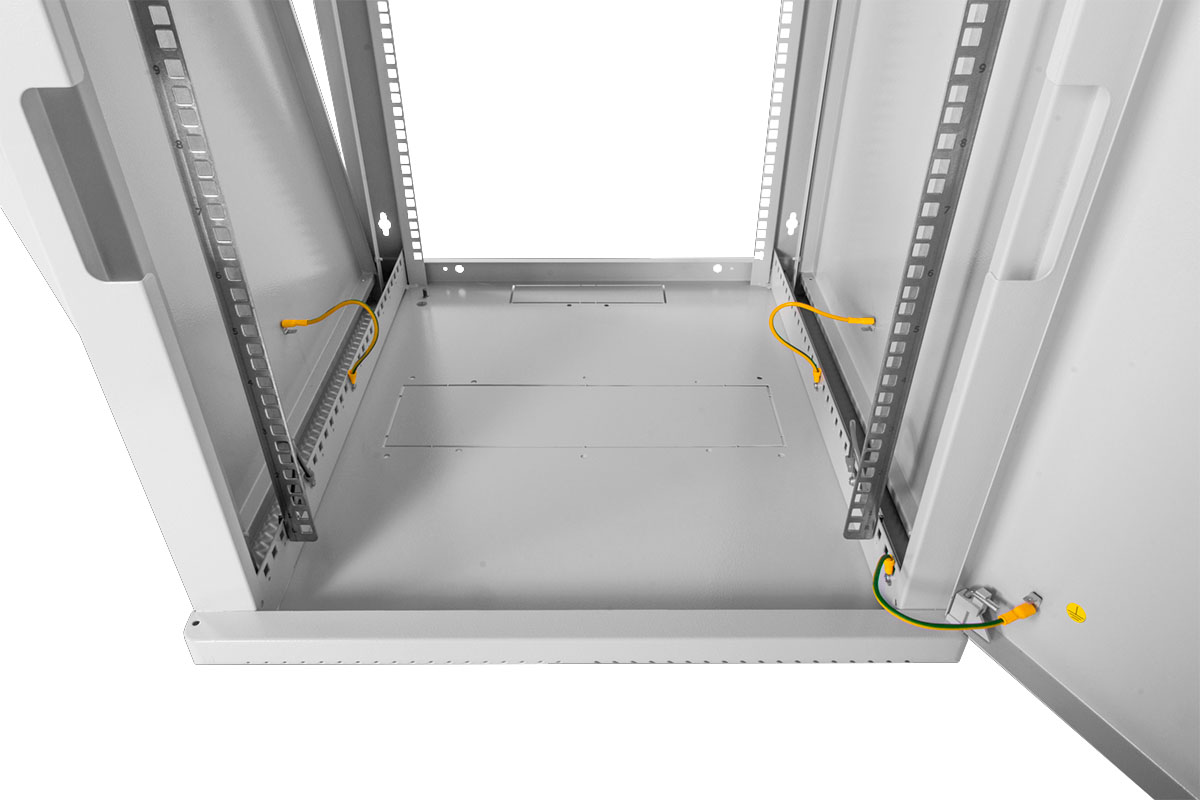 Решил повесить шкаф поглубже на 12 юнитов, чтобы длинные блоки не торчали. Боковые панели съёмные, упрощают работу с кабелями. Передняя дверь остеклённая, замок в комплекте. Стальной корпус держит нагрузку, при монтаже ничего не провисло, крепёж надёжный.