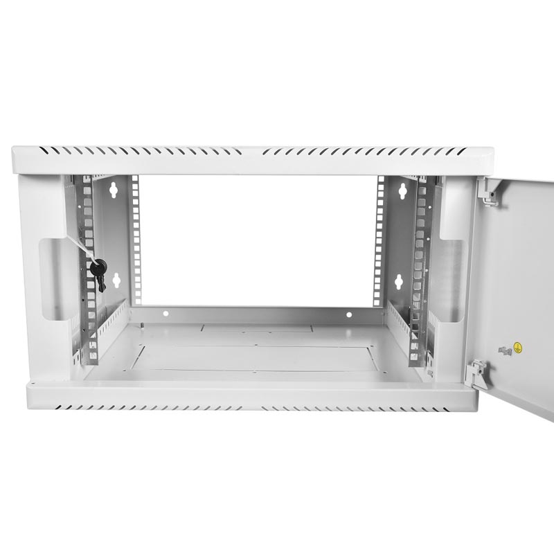 Отличный вариант, если сетевые устройства не помещаются в более короткий шкаф. Здесь 650 мм глубина, что даёт место для кабелей. 6 юнитов достаточно для небольшого офиса. Петли прочные, дверца из стекла, боковины снимаются, упрощая монтаж и обслуживание.