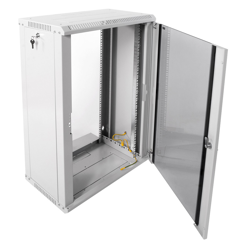 Высота 18 юнитов при глубине 350 мм — вместительный, но узкий настенный корпус. Подходит для многих 19\-совместимых устройств, дверца из стекла с замком. Монтажные рейки регулируются, боковые стенки снимаются. Металл не вибрирует, выглядит крепко.