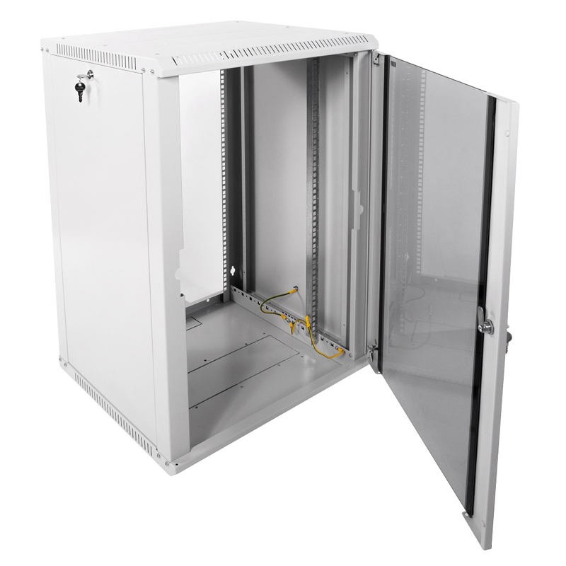 Были устройства глубже 350 мм, поэтому понадобился 500 мм, а по высоте 18U. Шкаф вешается на стену, дверца стеклянная, боковины снимаются, снизу/сверху отверстия под кабели. Места более чем, металл без заусенцев, сборка заняла пару часов.