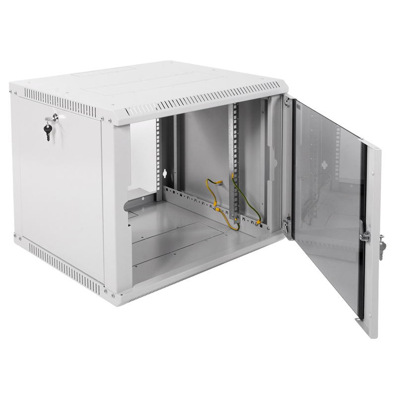 Пространство внутри достаточно, чтобы проложить патч-корды и питания без перегибов. Металл приятен на ощупь, без острых кромок. Дверь защёлкивается с мягким щелчком. Хороший вариант для распределённых сетевых точек.