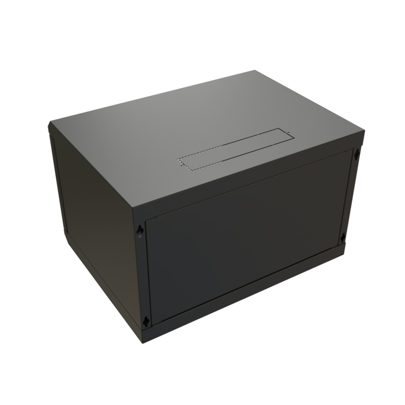 Модель на 6 юнитов, но глубина 600, чёрный корпус, дверца стекло. Предназначен для пары устройств чуть удлинённого форм-фактора, монтаж несложен, шума меньше, провода завёл сверху. Крепёж надёжный.