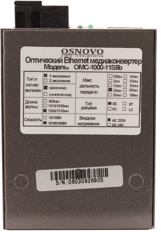 Выбрать товарыМедиаконвертер OSNOVO - OMC-1000, Витая пара RJ-45, Одномодовый SC, wavelength TX-1550 нм / RX-1310 нм, до 20Км, 1 Гб/с, OMC-1000-11S5b