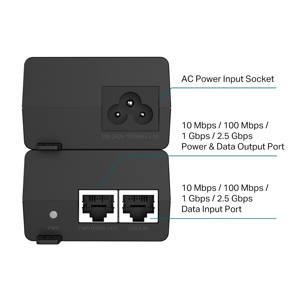 PoE-инжектор TP-Link 60 Вт передаёт питание и данные: корпус компактный, настенный монтаж, защита от перегрузок. При подключении точек доступа питание стабильно, скорость передачи данных высокая.