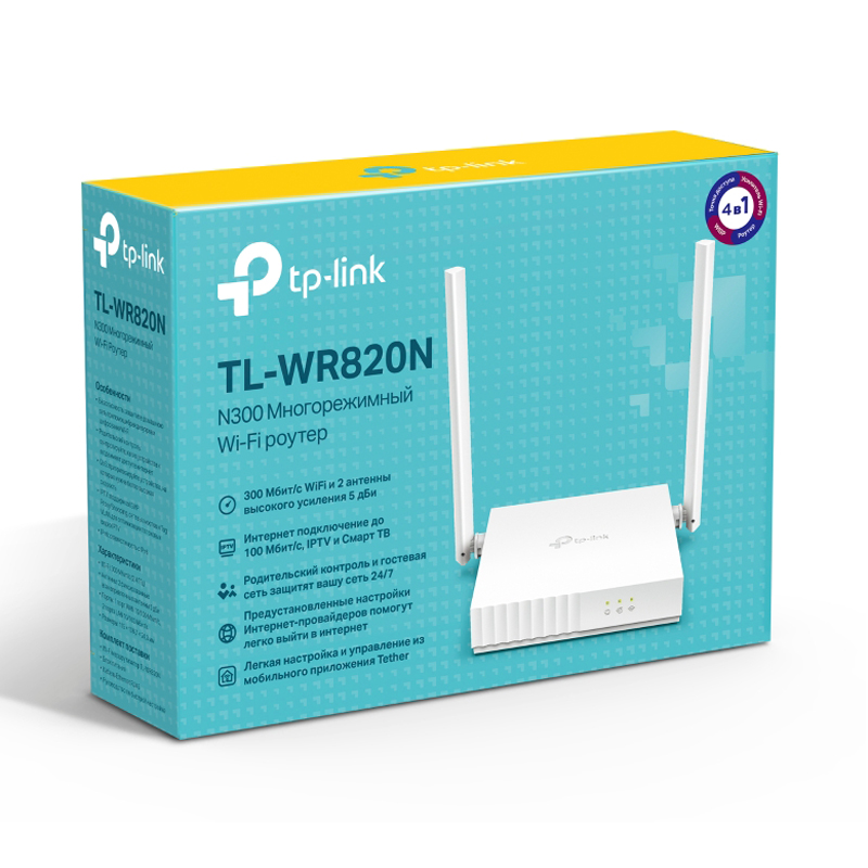 Беспроводной маршрутизатор TP-Link - TL-WR820N, 2.4 ГГц, 300Мб/с, IEEE 802.11 b/g/n, 2x RJ-45, 10/100 Мб/с, 2 antennas, Белый, TL-WR820N