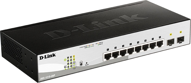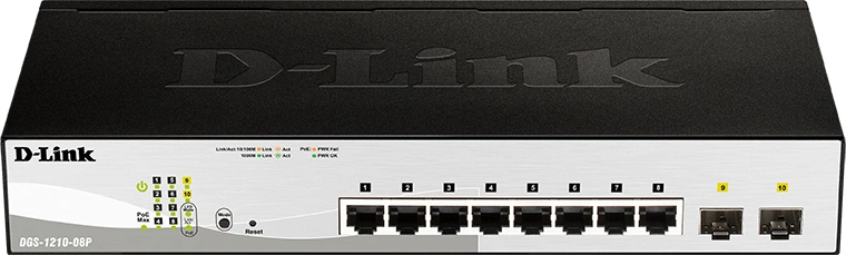 Коммутатор Настраиваемый (Smart) D-Link - DGS-1210-08P, Layer 2, 8-PoE, 8-1GbE, 2-SFP, ROM-32MB, RAM-128MB, SNMP, telnet, Web, в стойку, серебристый, DGS-1210-08P/G3A