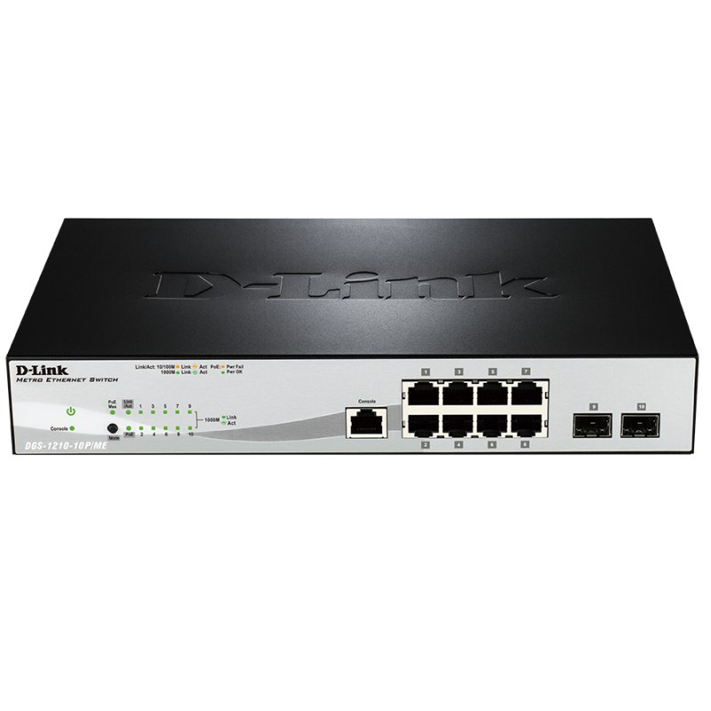 Коммутатор Управляемый D-Link - DGS-1210-10P/ME, Layer 2, 8-PoE, 8-1GbE, 2-SFP, ROM-32MB, RAM-128MB, SNMP, telnet, Web, CLI, в стойку, серебристый, DGS-1210-10P/ME/A1A