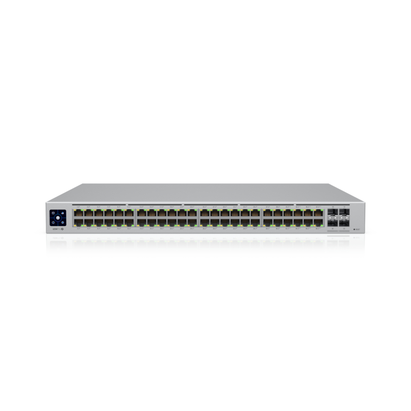 Серьёзный коммутатор с 48 PoE-портами и ещё 4 на оптике. Идеален, если нужно подключить кучу устройств в единую систему. Управление в едином интерфейсе, можно смотреть статистику.