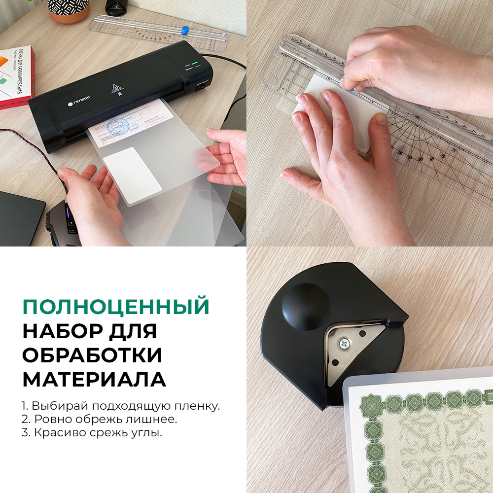 Подготовил комплект для презентации. Результат повторяемый, без брака: кромка чистая, углы гладкие, цвета выглядят насыщеннее. Понравилось, что устройство не перегревается и не шумит. Уход простой — протёр направляющие, и снова готово к работе. Хорошее соотношение удобства и качества итоговых материалов.
