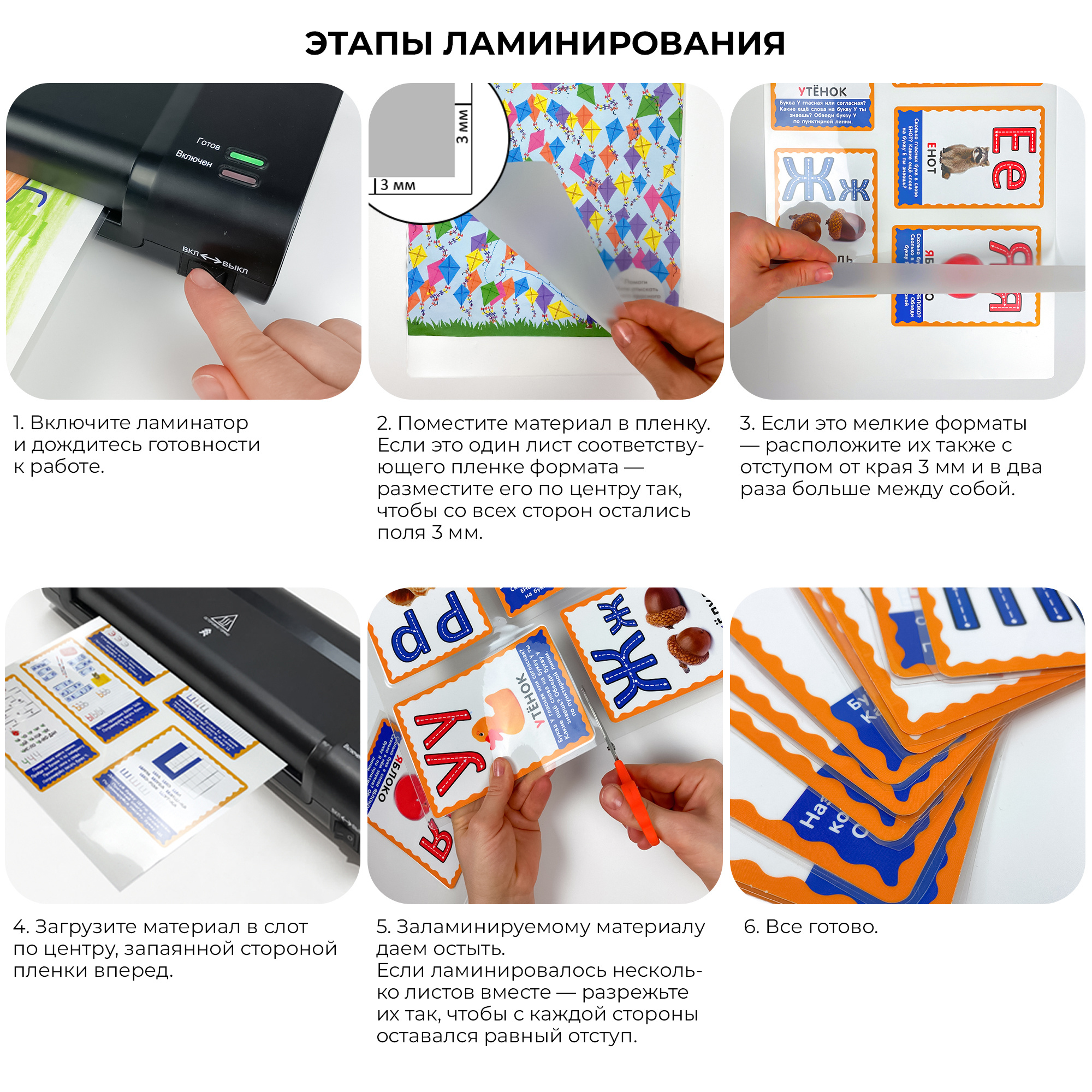 3. Ламинирование: Поместите документ в пленку и пропустите через устройство.