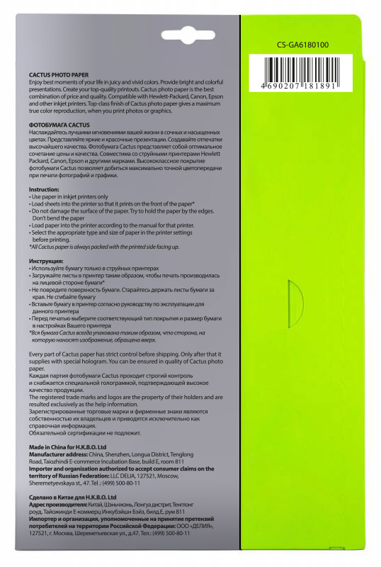 Упаковка бумаги CACTUS, 100л, покрытие глянцевое, 180г/м², белый, CS-GA6180100