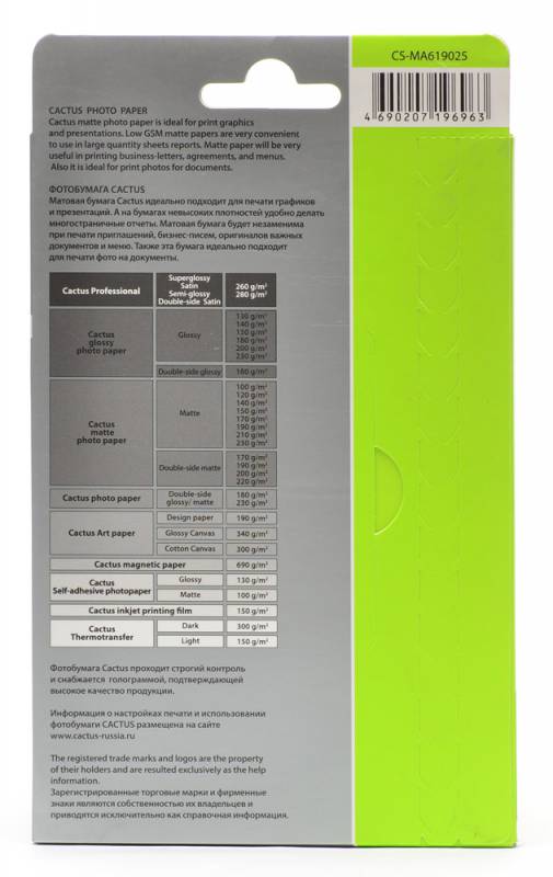 Выбрать товарыУпаковка бумаги CACTUS, 25л, покрытие матовое, 190г/м², белый, CS-MA619025