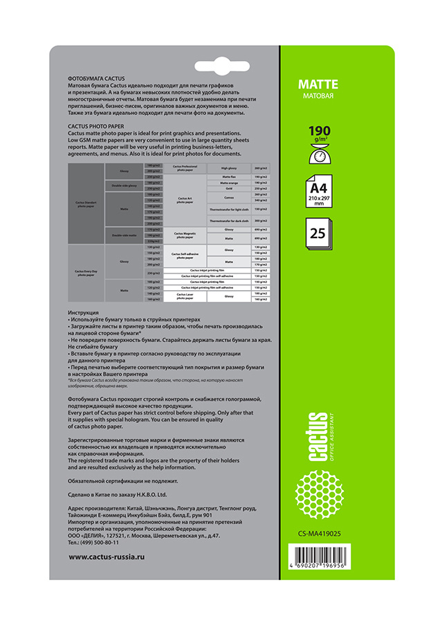 Упаковка бумаги CACTUS, A4, 25л, покрытие матовое, 190г/м², белый, CS-MA419025