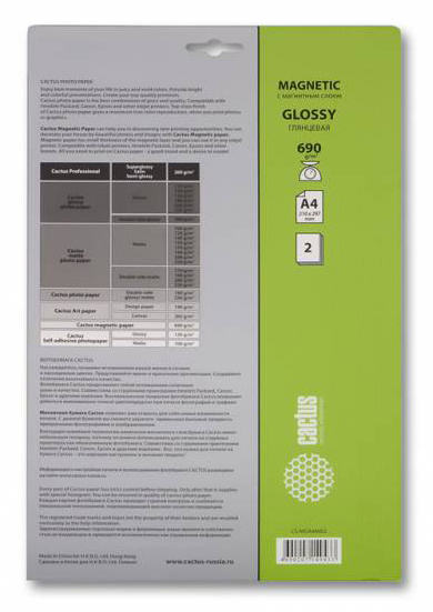 Уникальная бумага с магнитным слоем и глянцевой поверхностью, всего 2 листа, но плотность 690 г/м_. Можно печатать изображения и крепить на металлические поверхности. Листы почти как тонкий магнит.