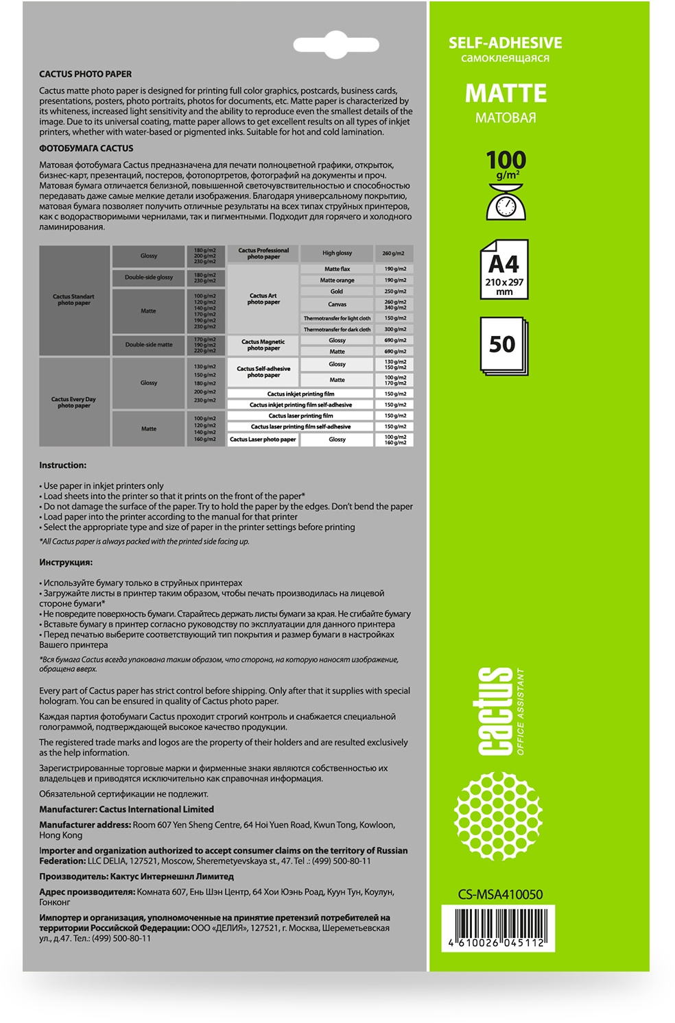Упаковка бумаги CACTUS, A4, 50л, покрытие матовое, 100г/м², белый, CS-MSA410050