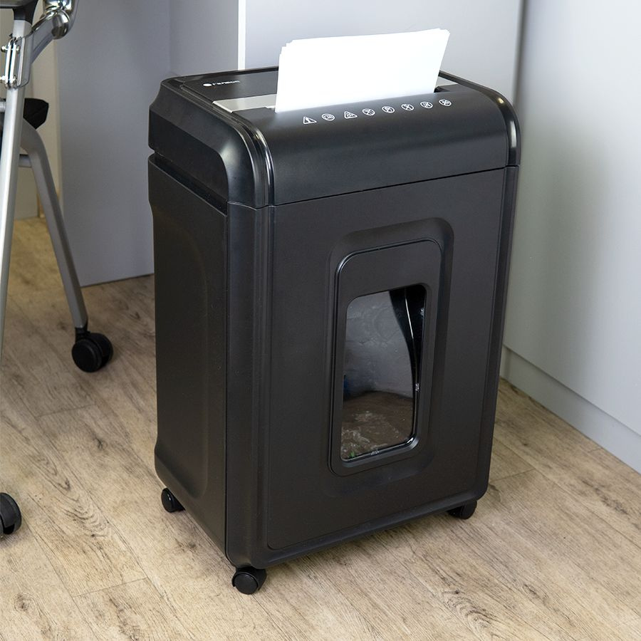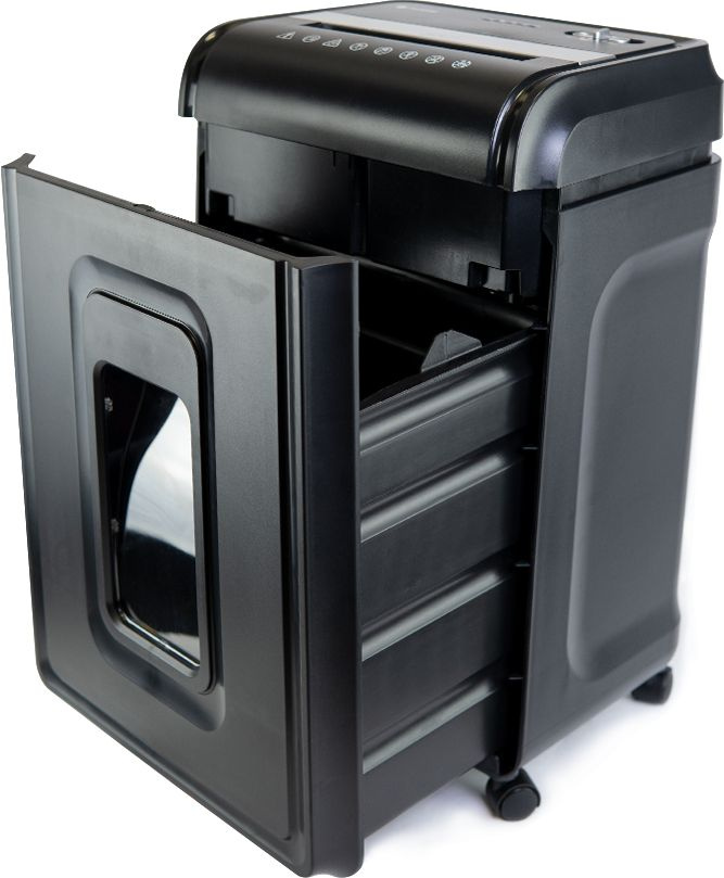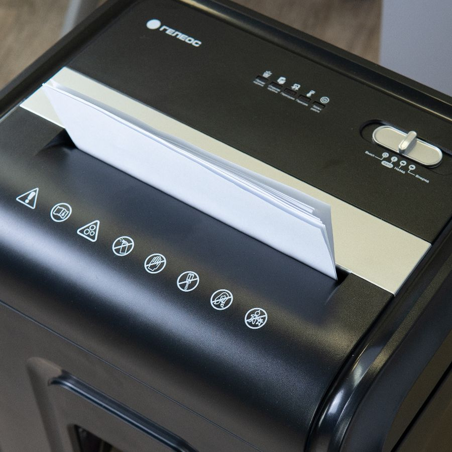 Для крупной компании — самое то: мощность впечатляет, в час переработает кучу документов. Уровень шумности не слишком большой, хотя внутри серьёзный двигатель. Резка крест-накрест, фрагменты крошечные. Управление понятное, кнопки крупные.