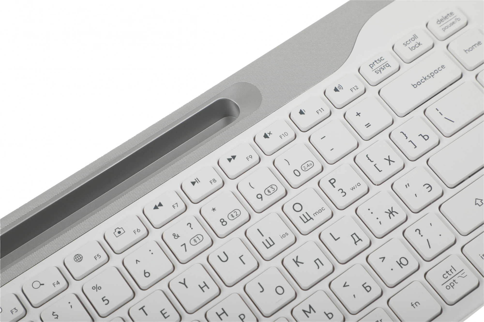 Этот комплект беспроводных клавиатуры и мыши в светлой расцветке смотрится очень аккуратно на столе. Подключение через один ресивер, нет путаницы с проводами. Клавиши низкопрофильные, набирать тексты удобно, мышка компактна.
