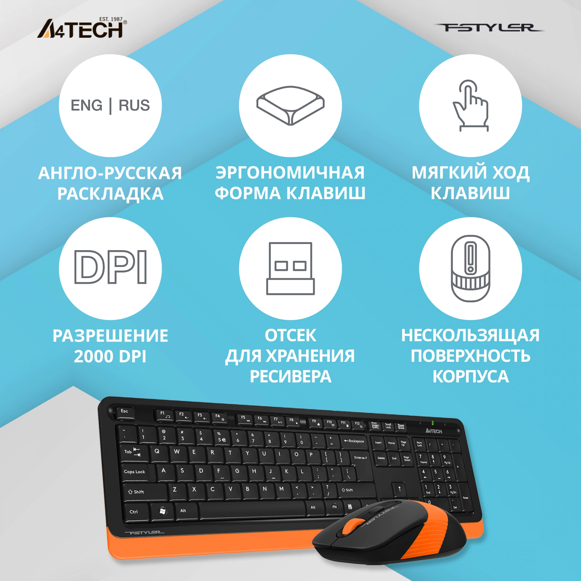 Выбрать товарыКомплект клавиатура/мышь A4Tech, Беспроводной, чёрный, FG1010 ORANGE
